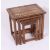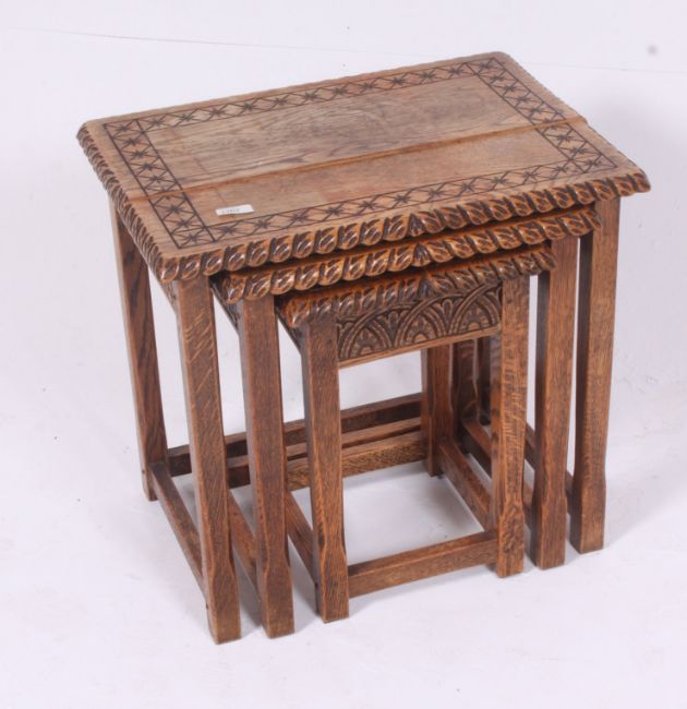 A Jacobean style carved oak nest of tables being raised on squared legs with stretchers having graduating tops above