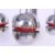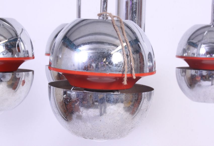 A 1950's chrome retro 4 branch atomic space age chandelier having chrome ball finial shades with red banded centres. H77 x W55 cm
