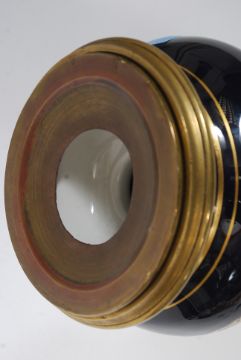 An early 20th century continental Meissen - Dresden style ceramic and brass lined vase. The cobalt blue ground having foliate spray panels. Atop a brass lid with brass base and lined interior. H33 cm