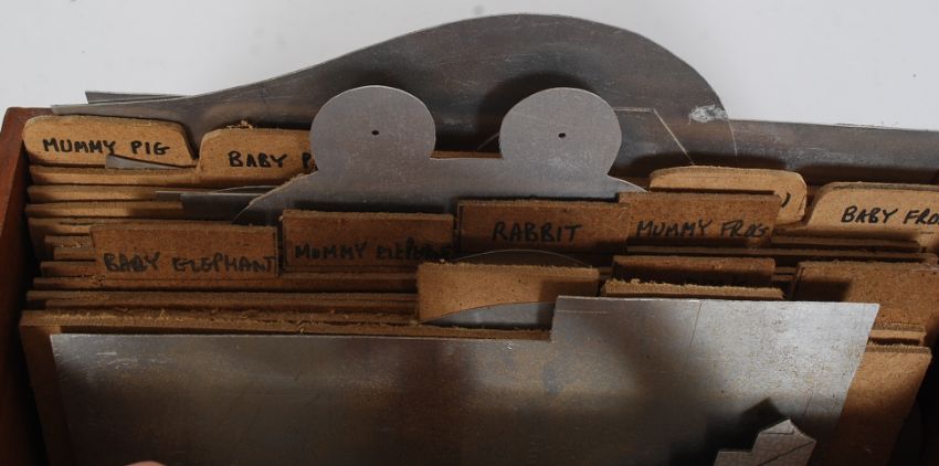 A collection of vintage stencils cut out of sheet aluminum to include Baby Rabbit, Mummy Frog, Baby Frog etc