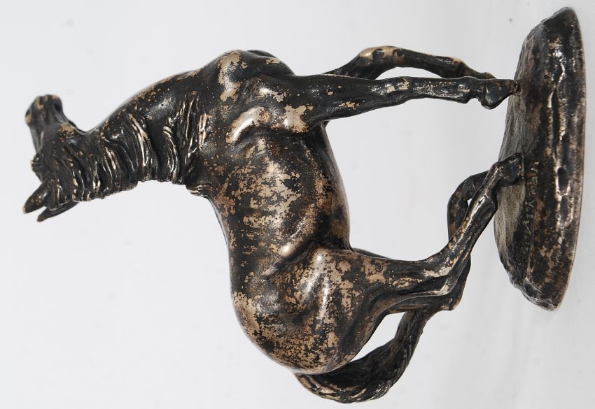 A fantastic hallmarked silver horse sculpture, ` Playing Up `, import marks for John Pinches, London, 1975, designed by Lorne McKean, modelled in a rearing position on a naturalistic base, on behalf of The British Horse Society, 11.5cm high, 613g approx