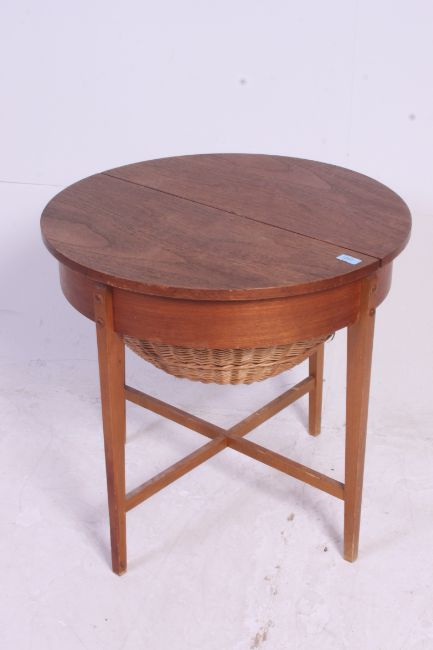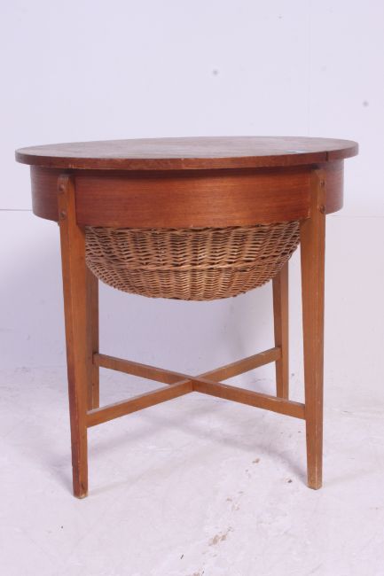 A retro sewing / work box having a whicker base, double lift up top with a compartmented lift out drawer. H62 x W66 cm