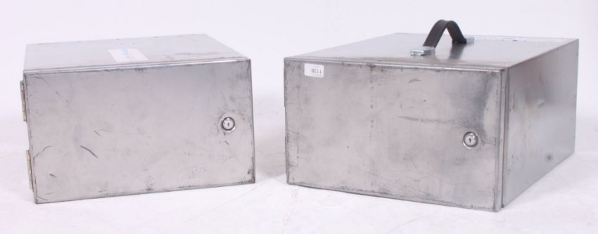 A pair of Industrial 20th century metal locker boxes. The polished steel bodies with lined polished interiors each with locker doors and one with handle. H23 x W40 x D48 c,m