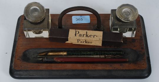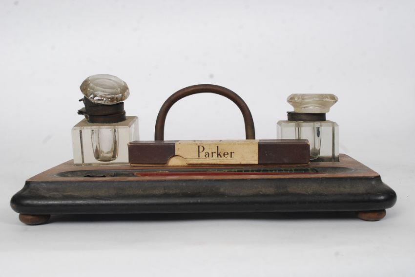 A Victorian mahogany desk tidy having glass inkwells with pen tray having fountain pens etc