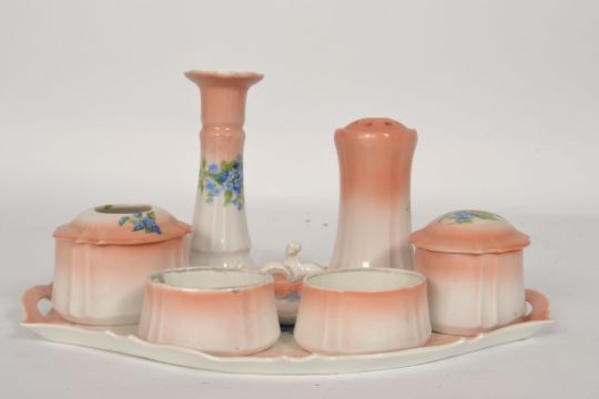 A good early 20th century continental ceramic dressing table set in pink with floral sprays together with a Crown Devon Fieldings dressing table ceramic tray of large form. H30 cm