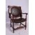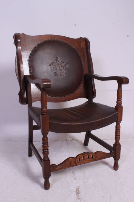 A 1920's oak and faux leather monks chair / table seat. The chair with crown carved stretcher having flip top solid oak table top back rest, the reverse with inset coat of arms.
