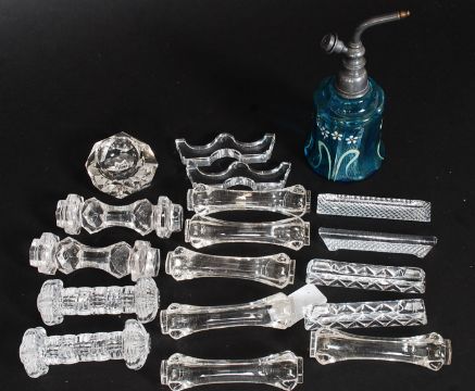 A collection of Victorian and later glass knife rests along with a blue glass perfume bottle