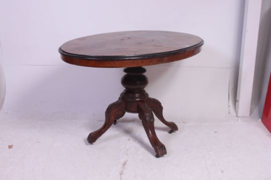 A Victorian mahogany oval tilt top breakfast table / dining table. Raised on quadruped base with tilt oval crossbanded top above