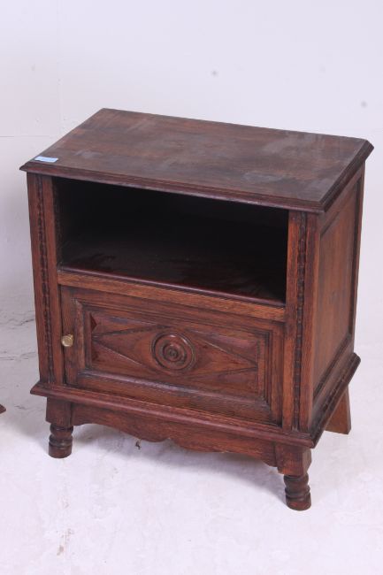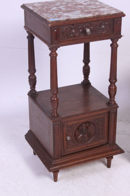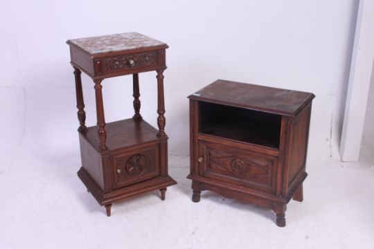 A 19th century French Brittany oak pot cupboard with single locker carved door, turned columns with inset marble top. Together with an early 20th century French oak low bedside cabinet having geometric panel door. H87 x W39 x D37 cm