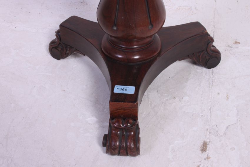 A Victorian mahogany tripod revolving piano stool having circular seat, inverse tapered column on tripod base. H48 x W36 cm