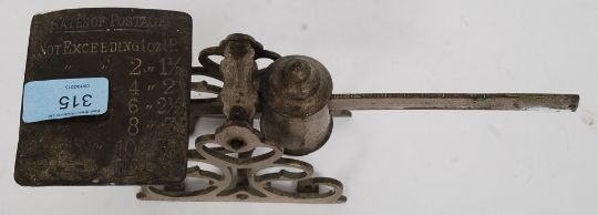 A set of vintage sliding postal scales in brass mounted on a mahogany plinth