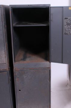 A set of 4 large factory industrial mid 20th cenutry vintage Industrial lockers with internal shelves in grey finish