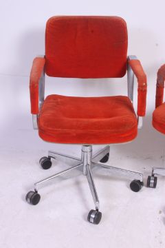 An excellent pair of chrome 1970's swivel chairs in the manner of Herman Miller bearing patent details for Waterloo, Ontario Canada. The velour padded seats and backrests, elbow rests upholstered removes to reveal chrome arms.
