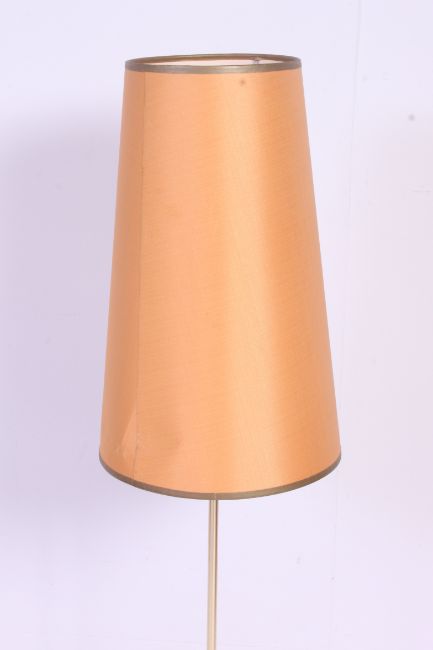 A vintage 1950's standard lamp table. The base on tapered legs with circular tier having upright stem and shade. H140 x W34 cm