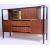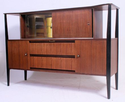 A vintage 1950's retro teak cocktail display cabinet having shaped ebonised columns with mirror lined cabinet over sideboard beneath