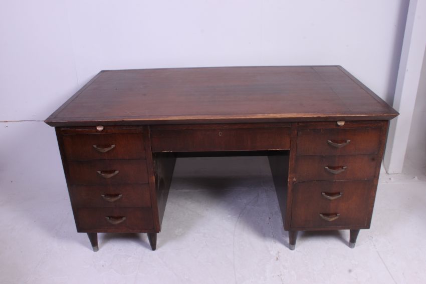 A vintage twin pedestal oak office desk with drawers to the pedestal. The desk by Sellex