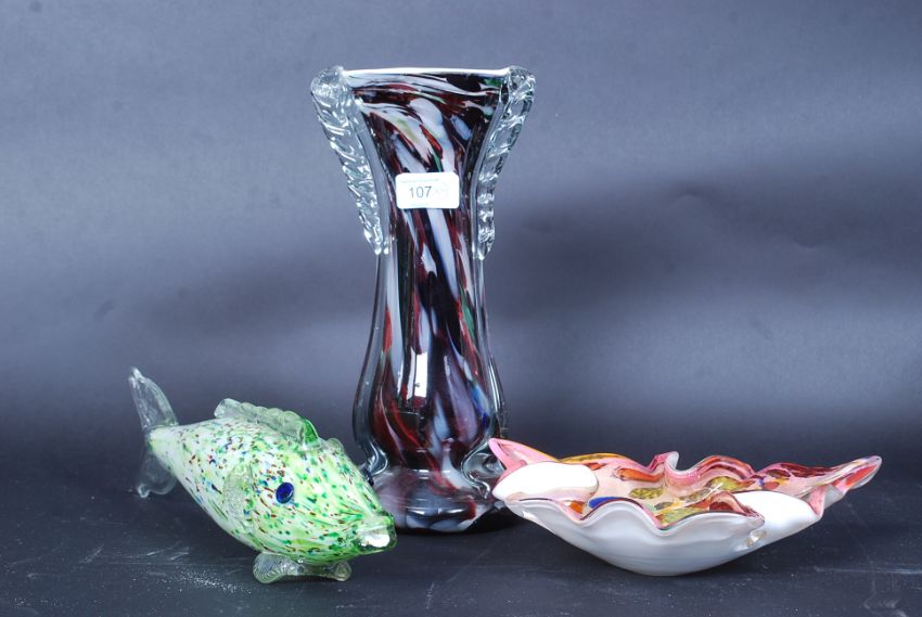 A good mixed assortment of studio glass to include Murano style glass vases, green glass and other items