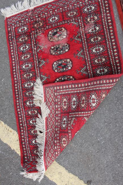 Two 20th century Indian style woven rugs (one a runner) both on red ground with tassled ends.