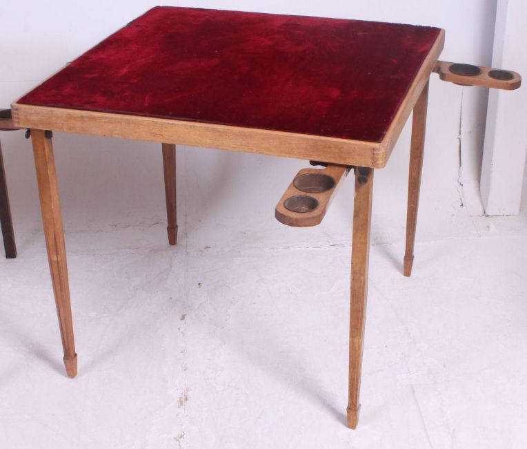 2 vintage mid 20th century village hall baize lined game / card bridge tables. Folding construction with square legs and chip holes. H68 x W77 x D77 cm
