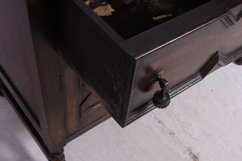 A 1920's small oak Jacobean revival sideboard. The body comprising a series of cupboards and drawers having stage gallery back atop. H89 x W104 x D50cm