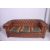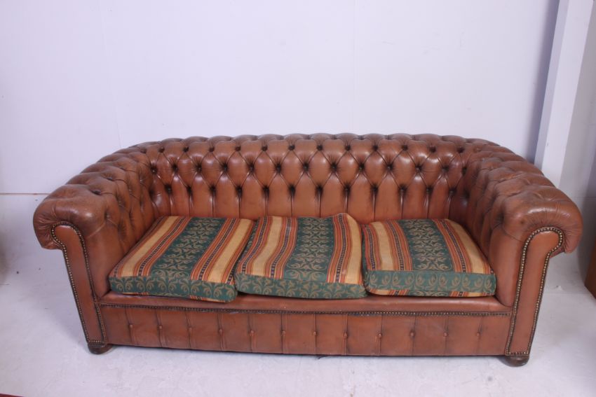 An antique style tan leather button back Chesterfield sofa settee. The barrel arms and back rest being buttoned with tan leather having squat bun feet