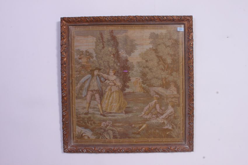 A 19th century tapestry needlepoint sampler being framed and glazed depicting a classical scene