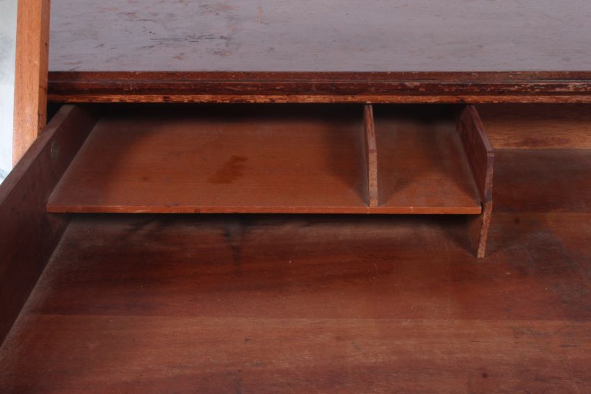 A 1940's post war gentlemans oak chest of drawers having a series of drawers to the chest with the top being fall front with swing dressing mirror and sectional interior. H80 x W107 x D46 cm