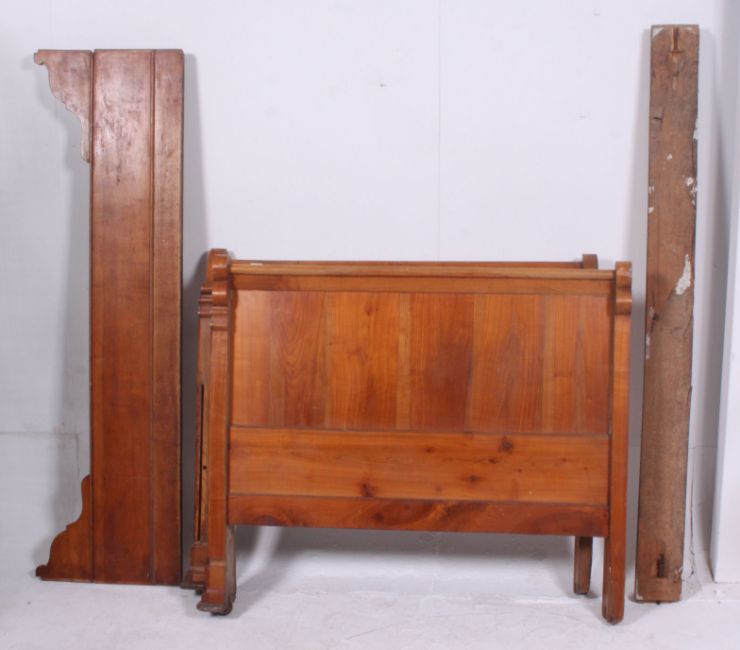 A pretty 19th / 20th century French country fruitwood sleigh bed with serpentine shaped head board and carved decoration