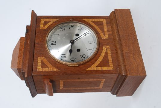 A mahogany inlaid cased eight day movement inlaid mantle clock striking on a coiled gong