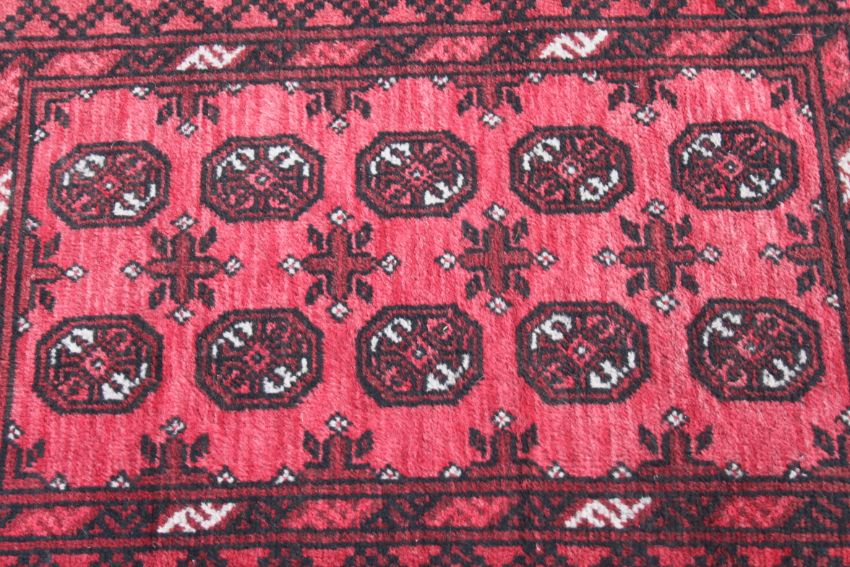 An Indian deep pile rug having red ground with elephant foot design to centre, black borders with geometric design. Measures 118cms x 84cms