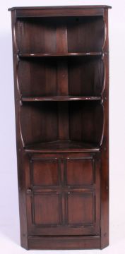A jaycee style jacobean revival oak corner cabinet. Open shelved upper section over cupboard beneath. H189 x W73 x D91 cm