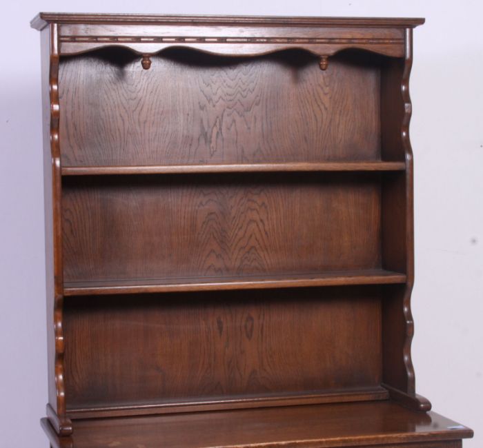 A Jaycee / Old Charm oak Gothic revival dresser having carved linen fold door cupboards under short drawers with plate rack atop. H176 x W93 x D43 cm