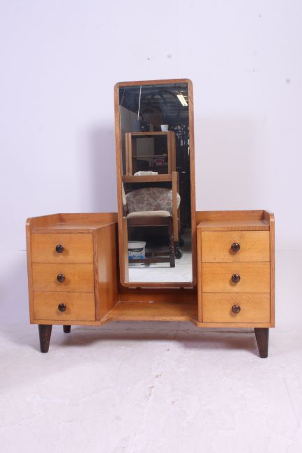 A Gordon Russell of Broadway, Worcestershire oak chest of drawers. The upright chest with a bank of drawers having gallery surround top. Makers plaque to rear. Matching Dressing Table & Stool, Bed & His-Hers Wardrobes in surrounding lots