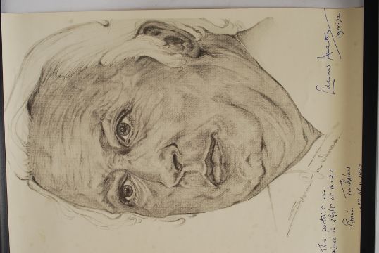 A printed pencil portrait of Sir Edward Heath with printed signatures by Brian Trubshaw and Sir Edward Heath. Framed and glazed.