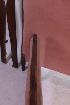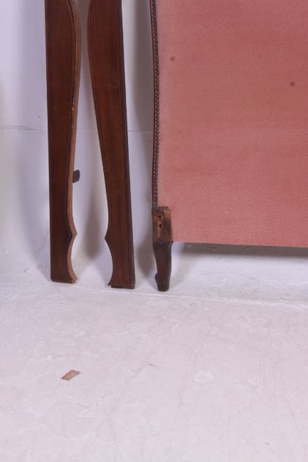 A 1930's French Louis XV style corbeille double bed having show wood head and footboard united by shaped runners with dusty pink velour upholstered panel work