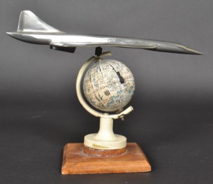 An apprentice piece Concorde set over globe and wooden plinth made by vendors family member who worked in filton, Bristol
