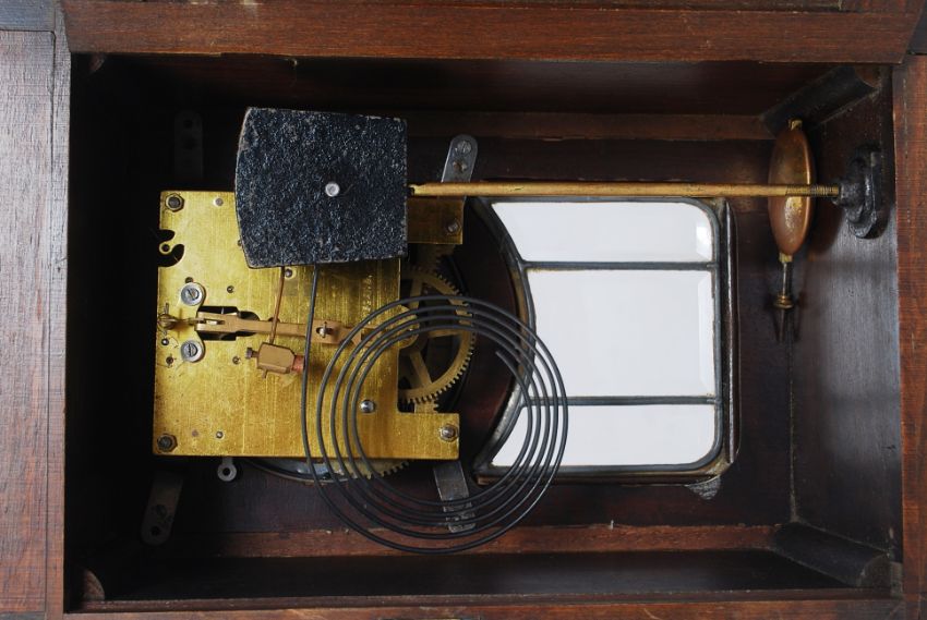 An oak cased 1930's mantle clock, brass face with eight day movement striking on a coiled spring. The oak case with glass pendulum window