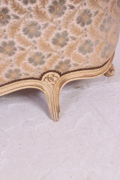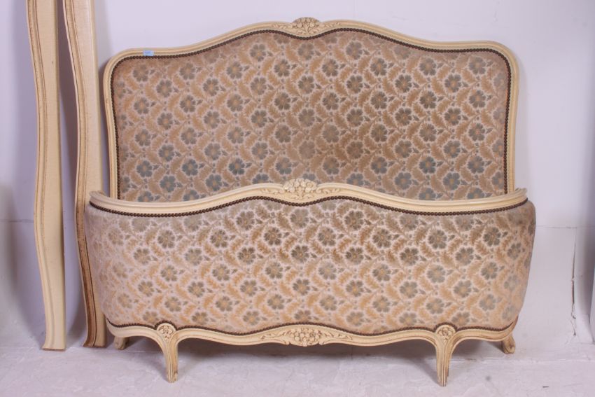 A 1930's French Louis XV style corbeille painted tapestry upholstered bow front double bed having show wood head and footboard united by shaped runners with stunning chenille upholstery to the head and footboards