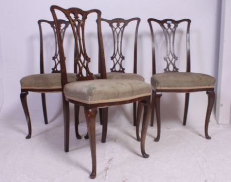 A set of 4 Edwardian Art Nouveau mahogany dining chairs. Raised on cabriole legs with overstuffed upholstered seats having shaped and pierced back rests