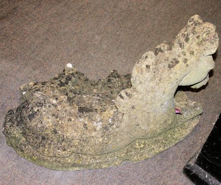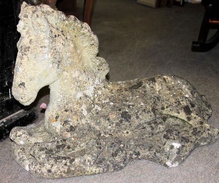 A good 20th century stone garden ornament in the form of a seated horse on naturalistic plinth base