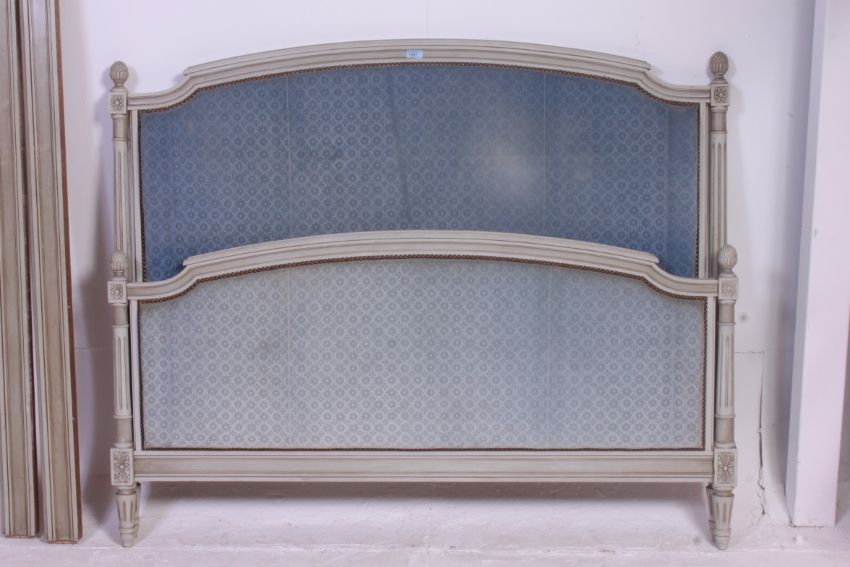 A Stunning early 20th century French Louis XV style painted corbel double bed having show wood head and footboard united by shaped runners with blue velour upholstered panel work. Finial tops complete the boards