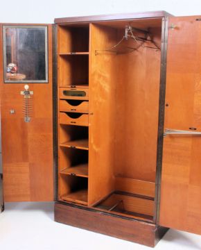 A 1930's Art Deco oak Compactom wardrobe. The plinth base with upright body having fitted fully appointed interior with haberdashery lined shelves cupboards etc within. H173 x W92 x D 52 cm