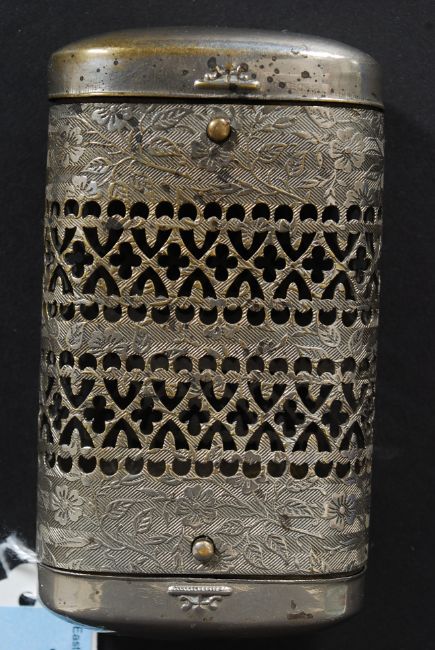 A Victorian stamped metal vesta handwarmer combination of lozenge form with fret worked centre adorned with foliate borders H10cm