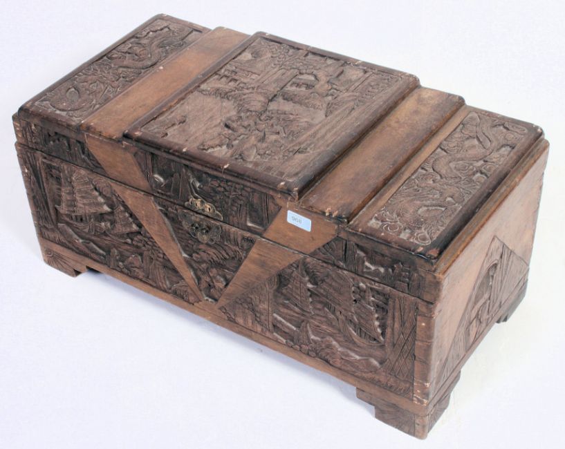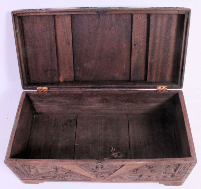 A 20th century Chinese 1950's carved blanket box chest having detailed carvings to front and top with staggered lid. H36 x W76 x D37 cm
