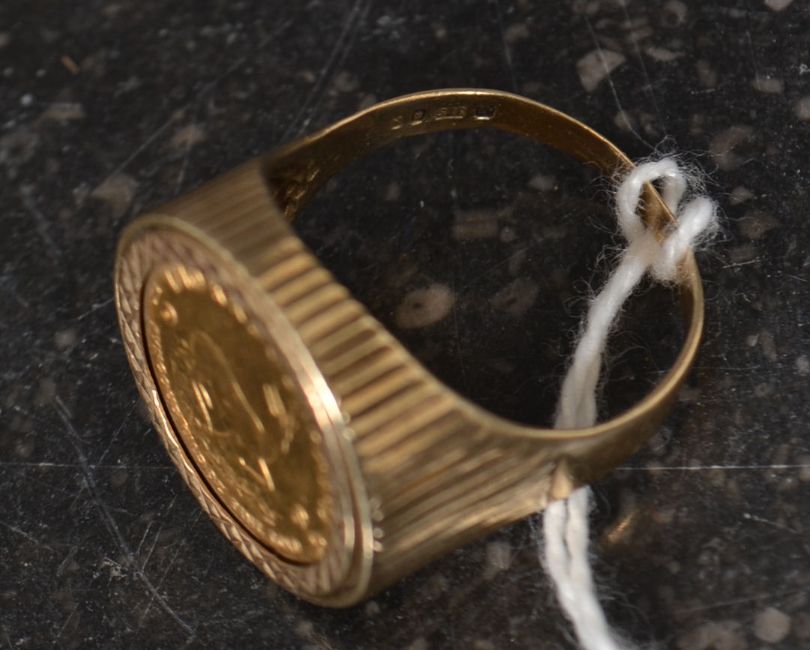 A 1984 gold one tenth Krugerrand coin being set within a 9 ct gold ring mount. The ring hallmarked to inside. Total weight 6.8g