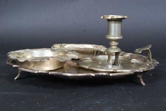 A collection of metalwares to include 2x Made In Occupied Japan brass dishes, a silver plated candlestick and a silverplated Bristol dish.