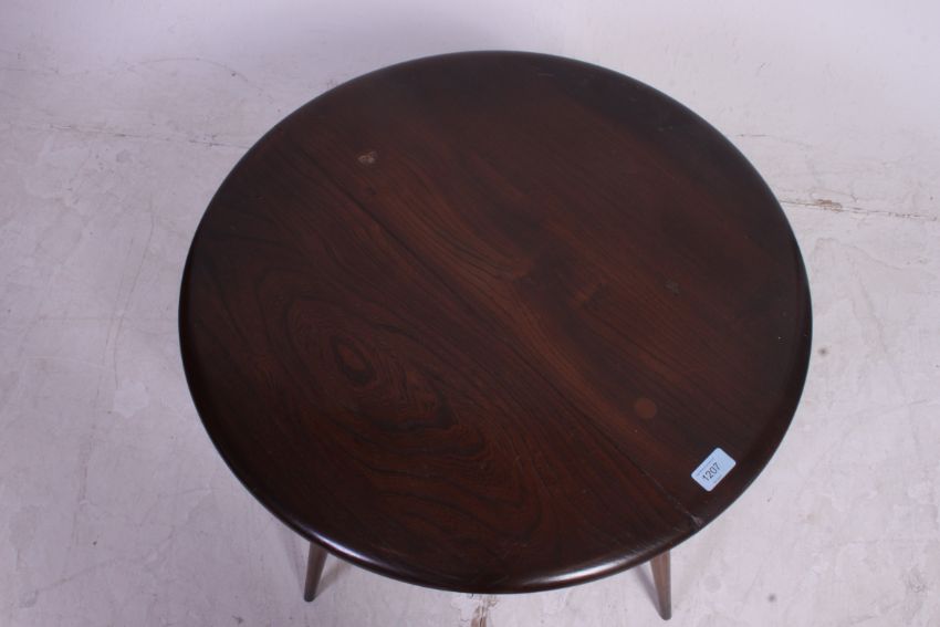 A Vintage Ercol elm and beech coffee table, in the Windsor Golden Dawn pattern dating to the 1950s / 60s era, blue Ercol label to base. H40 x W61 cm