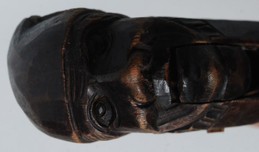 A pair of treen nutcrackers in the form of an old man in bedcap together with a treen knitting sheaf