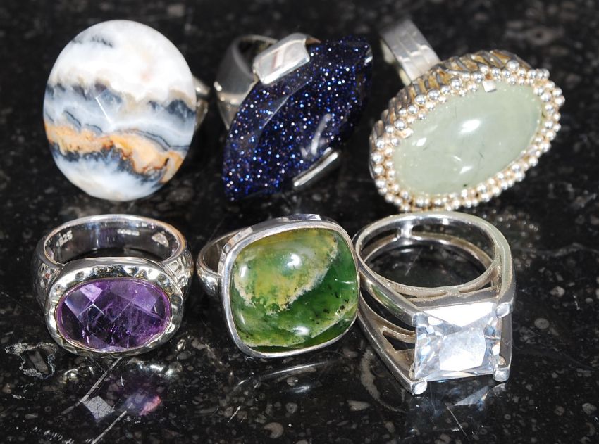 A collection of white metal 925 silver ladies oversized dress rings to include agate set, mineral stone set, amethyst, white quartz stone set etc ( 6 total ) 87.0g total weight