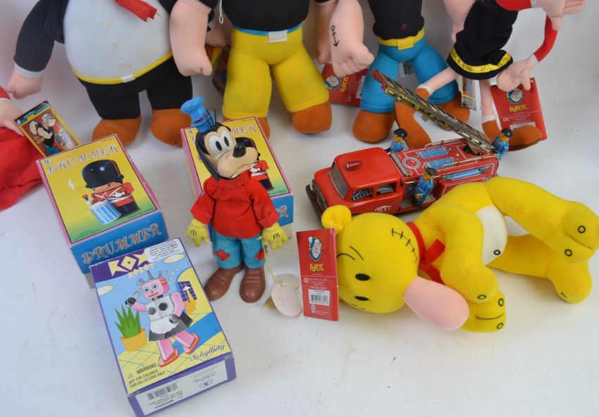 TOYS: A collection of original Kellyboy ' Popeye Classics ' stuffed character toys, along with a collection of vintage tinplate boxed toys, a Disney Products Goofy figure and other items.